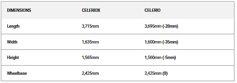 - Ground Clearance: 165mm (no change for the CelerioX)