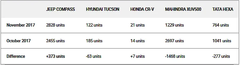 Despite the addition of an all-wheel-drive variant in October, the sales of the Hyundai Tucson still lags behind the others in the segment. It continues to remain in the sub-200 units bracket. Sales of the XUV500 and the Hexa too have dropped. The top-spec variants of the XUV500 and the Hexa clash with the mid-spec variants of the Compass. It is quite possible that the latter is eating into Mahindra and Tata’s share. On the other hand, the Honda CR-V is in dire need of a replacement (expected to arrive in 2018) as it is the sole petrol-only offering in the segment and its sales numbers are nothing to speak of.
