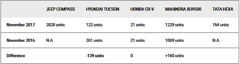 Compared to last November, the Compass and Hexa are the two new additions in the segment. Evaluating the sales figures of November 2017 with the same period last year, it is evident that the Hyundai Tucson is now living under the shadow of the Compass. November 2016 was the month when Hyundai launched the Tucson in the Indian market. The Honda CR-V continues with its sub-50 figure as it did last year. The Mahindra XUV500 saw a marginal boost last month compared to same time last year. However, we’ll have to wait and see how the recently added petrol automatic variant will affect its sales.