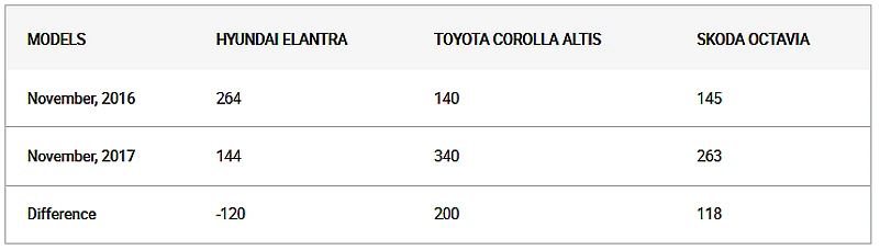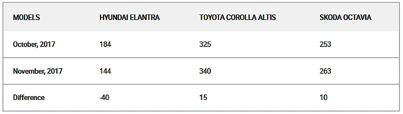 Sales of the Hyundai Elantra were nowhere close to its stablemates in October. In fact, the numbers dropped further in November. This could possibly be due to cannibalization from the newly launched Verna which has several first-in-class features and also bears a lot of resemblance to the Elantra. As for the Toyota Corolla Altis, it comes out on top of the class with sales numbers further increasing by 15 units. The Skoda Octavia recently received the RS variant which we can’t stop drooling over, but the latter couldn’t make any significant contribution to its sales due to its expensive upkeep. Overall, the numbers have been satisfactory for the Czech car considering the Corolla’s sales.