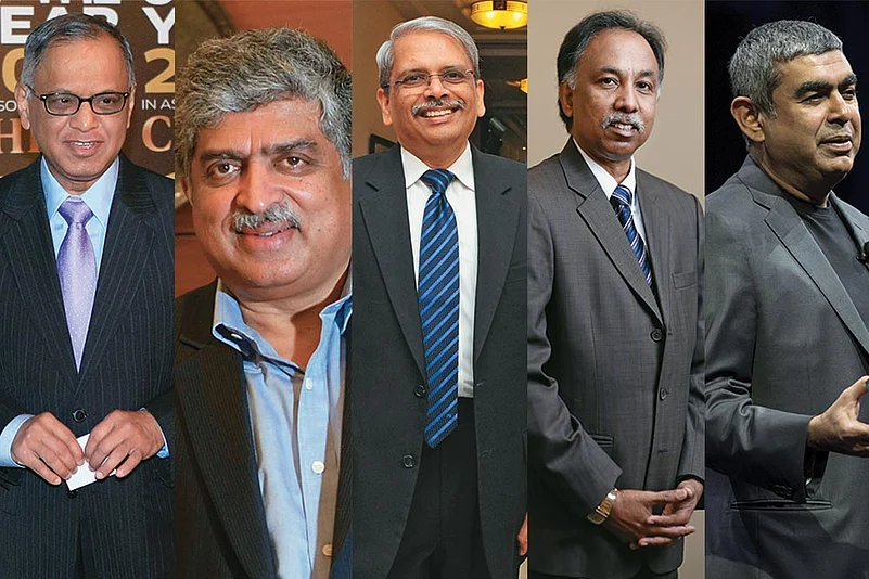 (From left) Nandan Nilekani, N.S. Raghavan, Kris Gopalakrishnan, N.R. Narayana Murthy, S.D. Shibulal and K. Dinesh