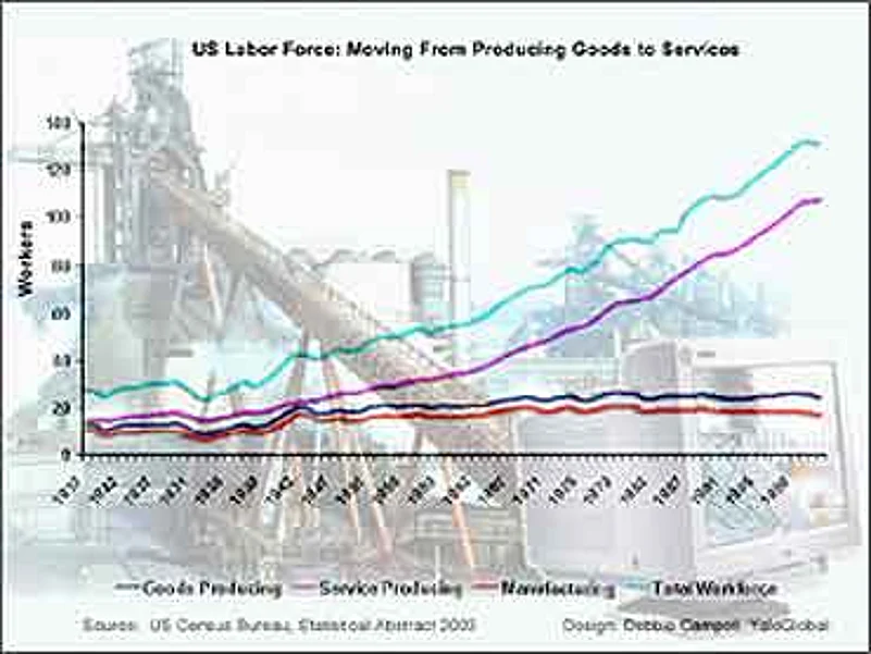 This new and cheap capacity has emerged at a time when corporations, emerging from recession, are desperate for cost-cutting measures to boost profits. With manufacturing transferred overseas, high-speed imaging and communication technology can help cut costs even further - in software applications, data processing, accounting, and customer service. (See Chart 2) Many large US corporations have become "virtual" manufacturers. Although their product design and marketing is done in the US, the actual production work is carried out in lower cost locations like China or Mexico.