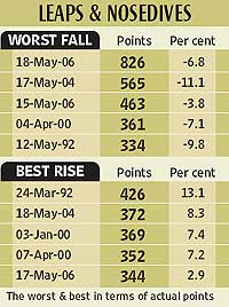 But the damage had been done by then. During the 826-point collapse, every stock in the BSE's 30-stock Sensex and the NSE's 50-stock Nifty fell. Other indices (like mid-cap and the sector-specific ones) on the two exchanges crashed by 4-8 per cent. Of the nearly 2,500 stocks regularly traded on the BSE, 2,250 registered medium to heavy declines. Only the remaining few registered small gains or hung on to their previous day's levels. Most stocks that rose were of lesser known low-cap firms. These included trn Textiles, Weizman, Nucent Finance and Keynote Corporate Services.