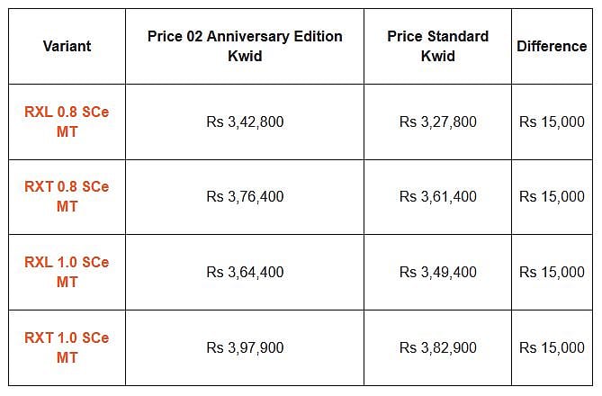 None. The 02 Anniversary Special Edition only adds some cosmetic changes. Both engines remain untouched and while the 0.8-litre Renault Kwid delivers 54PS/72Nm, while the 1.0-litre version produces 68PS/91Nm. The primary omission with the special edition is the automated manual transmission (AMT) option.