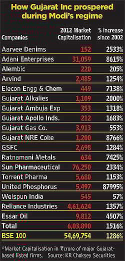 Thus started ‘Vibrant Gujarat’, a showpiece event to woo industries, during which Modi is shown hobnobbing with top Indian honchos and overseas investors. Over the past decade, Modi has given a push to many emerging sectors like chemicals, automobiles, petrochemicals and energy in the state. Today the oil refineries of Reliance Industries and Essar, the ports of the Adani Group, power plants of Torrent, pharma plants of giants Cadila and Dishman, the Nano of the Tatas, they all showcase the state’s big strides in industrial growth. Predictably, these are ranked high among the Modi favourites for special dispensation.