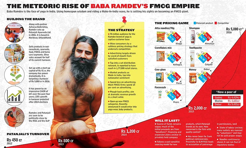 Roy’s report did not take into account the branding or promotion through Baba Ramdev’s Aastha channel. However, it did consider the huge following at his yoga camps—Edelweiss estimates a potential reach of 200 million without having to mainstream advertising expenditure, and relying largely on word-of-mouth. “They are simply not greedy,” says Devinder Sharma, an agriculture expert who has been in touch with Baba Ramdev since the latter struck a clarion call against corruption in 2010. “Also, we do hear from time to time of a Nike or an Adidas breaking labour laws or other regulations—why then, when it comes to Baba Ramdev and Patanjali, is everybody suspicious?” he asks.