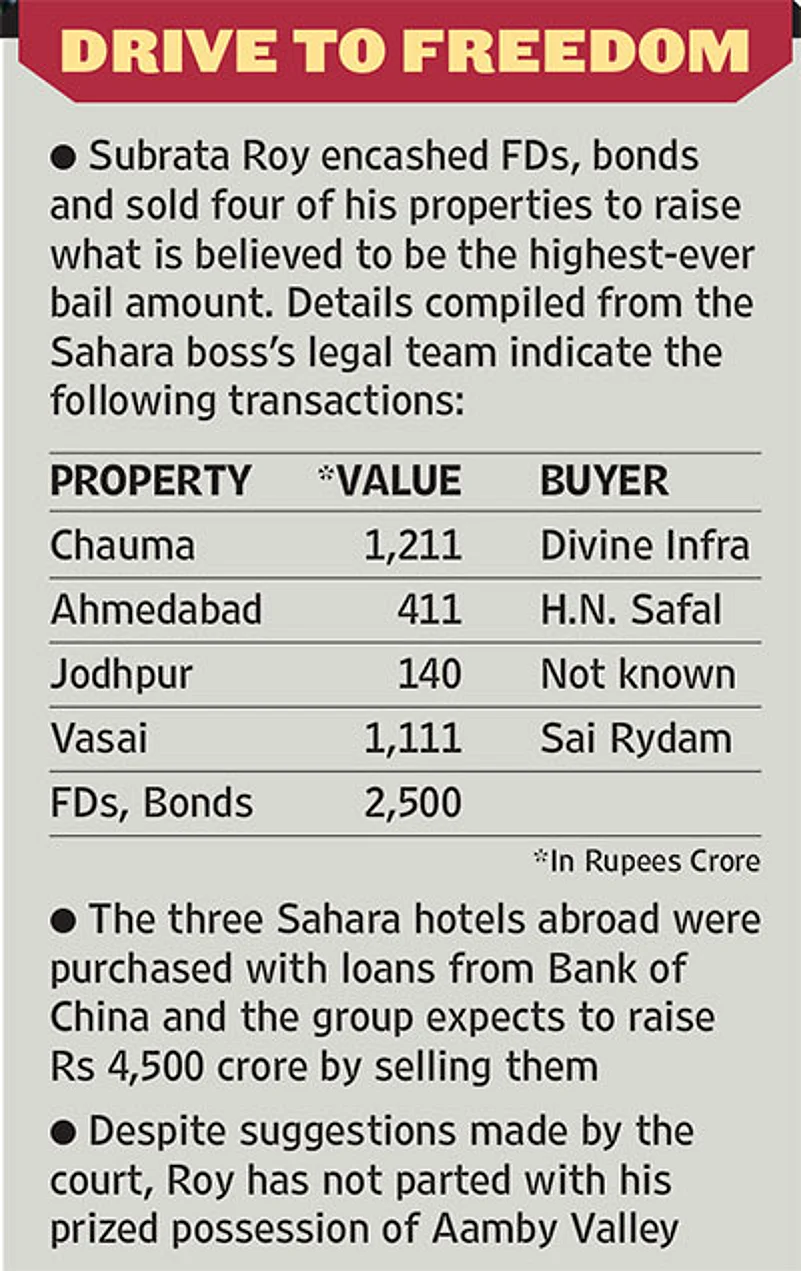 Never before has any Indian been asked to pay up so much upfront to regain his personal liberty. But even if Roy walks out of Tihar, his troubles are far from over. The apex court expects him to arrange an additional Rs 25,000 crore according to a schedule, failing which he could find himself back in jail. Those close to Roy say that he has been trying to liquidate Sahara Group’s properties almost all by himself from his Tihar jail office.