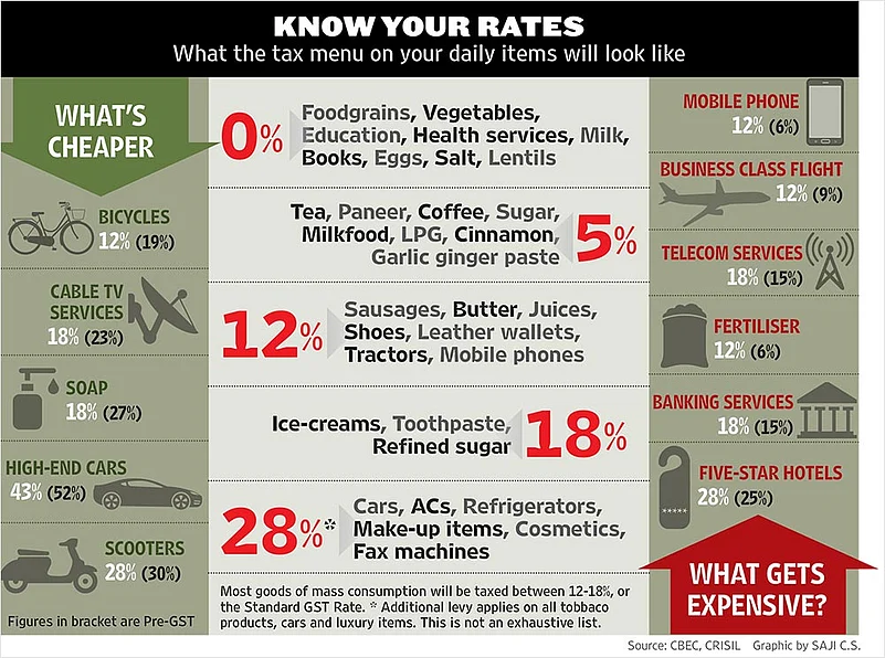 Sample this: Toothpaste gets taxed at 18 per cent, for instance, while air conditioners, cars and refrigerators will be taxed at 28 per cent. Economy airline tickets will be at 5 per cent, but business class will attract a 12 per cent GST. Unprocessed food-grains, milk, fruits and vegetables as well as services such as education and health will be exempted.