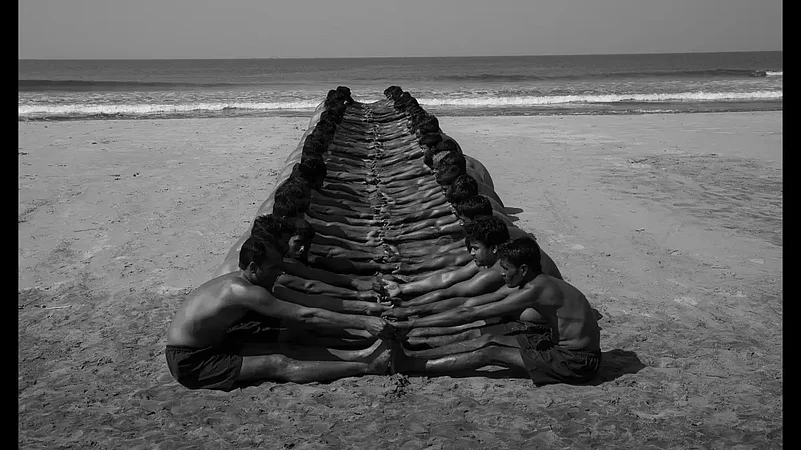 The initial experiments had him hooked, and then he just devoted himself to the whims of its waters and is now a full-time artist and founder of the Museum of Goa at Pilerne. “When the waves break, the surf runs under the sand. Most of the waves wet the sand that was wet before. Then a big wave goes ahead and wets new sand. Creativity in art and writing is about wetting this new sand,” he says. It is why he constantly aspires to search, find, and make new stories about the ocean. If created at the oceanfront, even better. His methods involve choreographing armies. Armies of fishermen, mussel shells, plastic bottles, soil—an upcoming idea is to make an island from the soil of every country and dissolve borders, when the soil of Israel, for instance, will mix with the soil of Saudi Arabia. In another experiment, he wants to create floating sculptures from wood, “which I will take in a boat to the middle of the ocean and throw them in, and then they will find their own coast”. And their own masters.