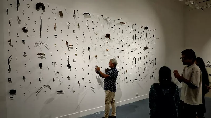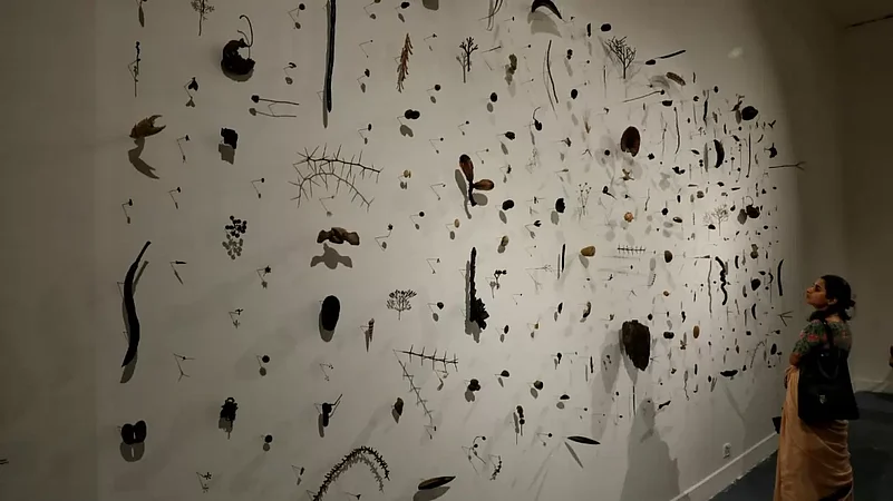 Addressing the issue of climate change, the exhibition featured pieces such as "Vertical Eye-Land" by Pinaki Mohanty and Sudipta Das' collection of paper sculptures. Pinaki Mohanty’s “Vertical Eye-Land" relived memories of Chilika Lake's vulnerable community, while Sudipta Das’s paper sculptures highlighted the plight of climate-vulnerable communities in Silchar and their abandoned possessions. To Achari, these works convey the “urgency to address our interaction with objects and memories amid climate change” and the “emotional toll of letting go”.