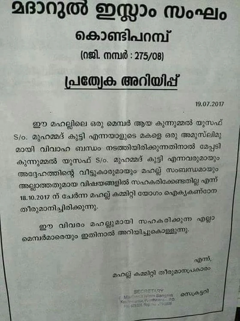 The circular in Malayalam stated, “Since one of the members of this mahallu, Kunnummal Yusuf, S/O Muhammed Kutti has married off his daughter to a non-Muslim, a meeting of the Mahallu Commiitte held on 18/10/2017 has unanimously decided not to cooperate with his family neither for mosque related things nor for any other things.”