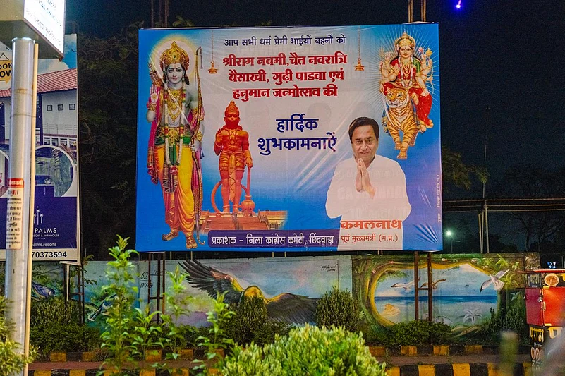 The saffron festoons, Jai Shree Ram flags and banners celebrating Navaratri may be mistaken for a BJP campaign. But a few metres away, the king-size poster of Kamal Nath with Ram in bows and arrows clear the clouds of confusion. The poster reads- “Heartiest greetings of Ramnavami, Chait Navaratri, Baishakhi, Gudi Padwa and Hanuman Janmotsab to my religious brothers and sister- Kamal Nath”. Though Eid was just around the corner, the poster conspicuously forgot to mention it.