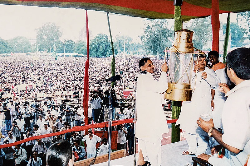 In 1989, when the Janata Dal—formed after the merger of several political parties—split, Yadav remained with the Samajwadi Janata Party (SJP), a faction of the Janata Dal headed by Chandra Shekhar. It was in 1992 that he broke away to form his own party—the SP. At the broadest level, the SP was presented as a party promoting the principles of liberty, equality, justice and democracy. After the party was founded, it won the UP legislative assembly elections the following year, in alliance with the Kanshi Ram-led Bahujan Samaj Party (BSP). Mulayam became UP chief minister for the second time, the first time under the banner of the SP. The wrestler-turned-politician garnered immense support from sections of the OBC and Muslim communities. His rise in the political realm became a source of great pride among the backward classes who resonated with him.