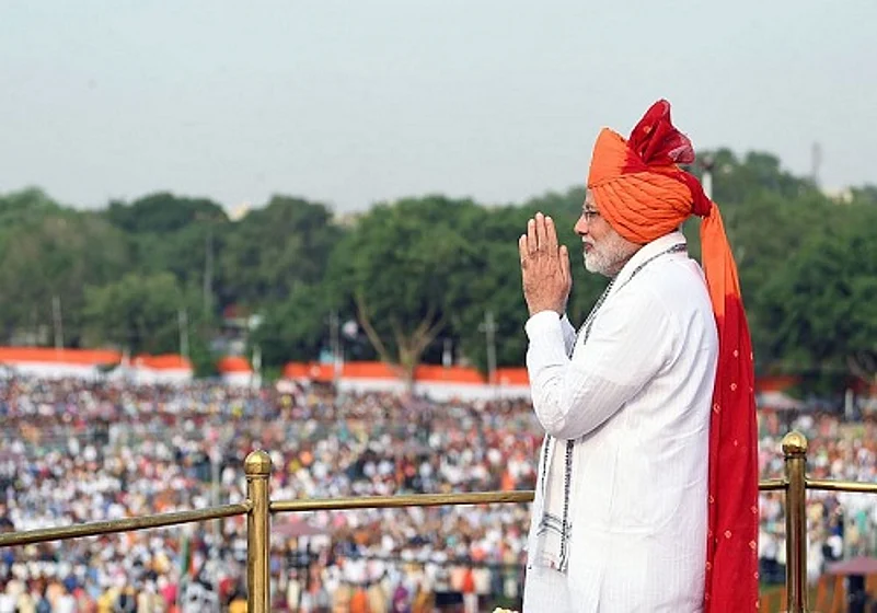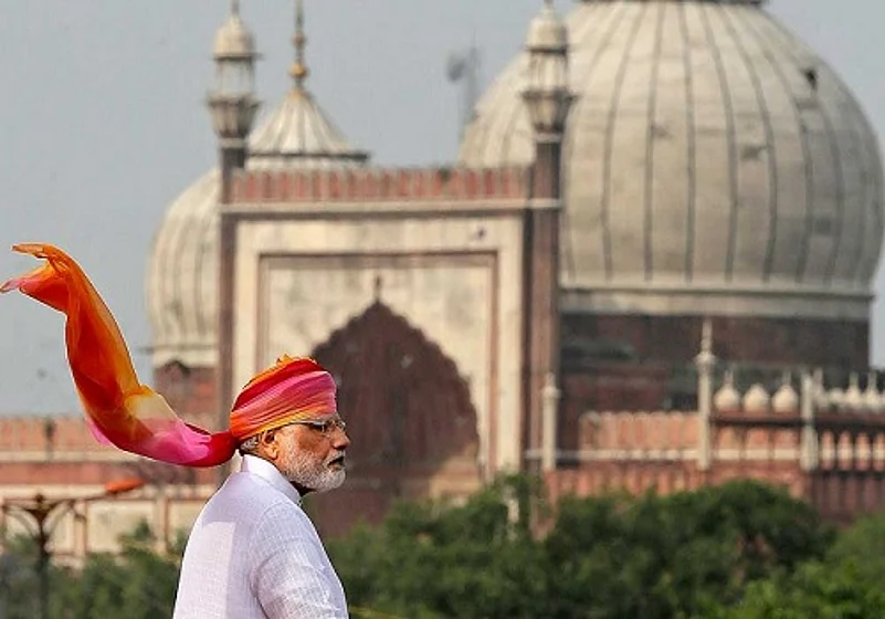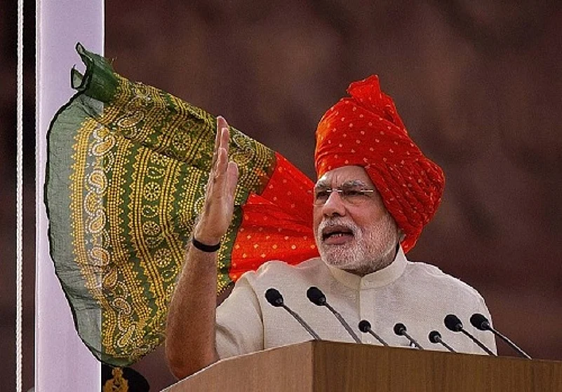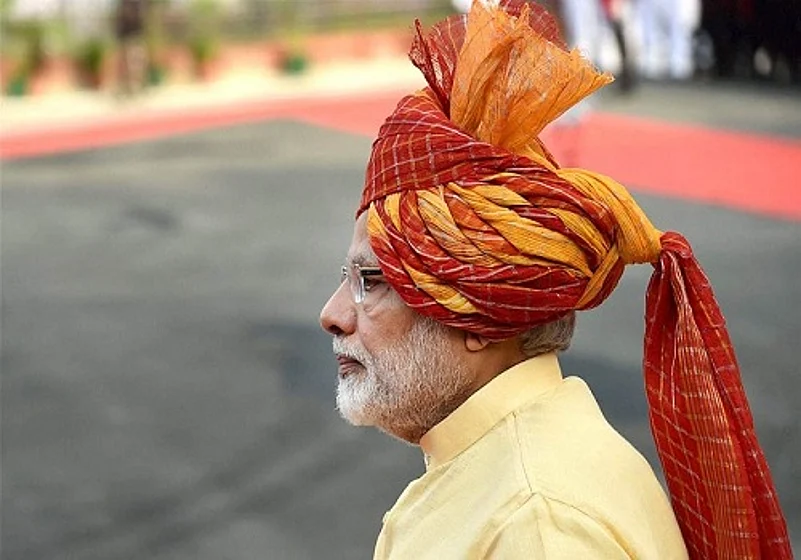 Prime Minister Narendra Modi on Wednesday sported a saffron turban while addressing the nation on the 72nd Independence Day from the ramparts of the historic Red Fort.