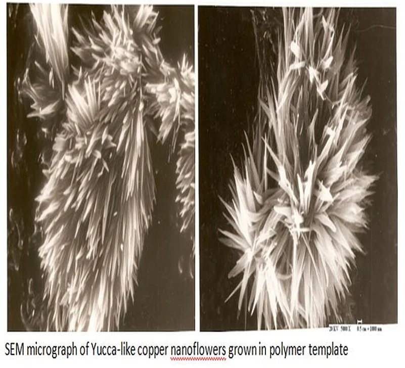 It has been observed that the best flower patterns are created by electro-deposition of copper in polymer templates. Due to poor conductivity of polymer, free flow of copper ions into pores of template to form Nanowires is restricted, resulting in the over-deposition at the cathode surface in the form of nanoflowers. The beauty of these experiments is that no identical patterns are produced on repeating the experiment. It remains an enigma and defies scientific explanation.