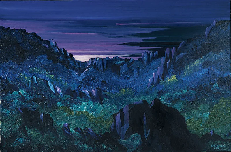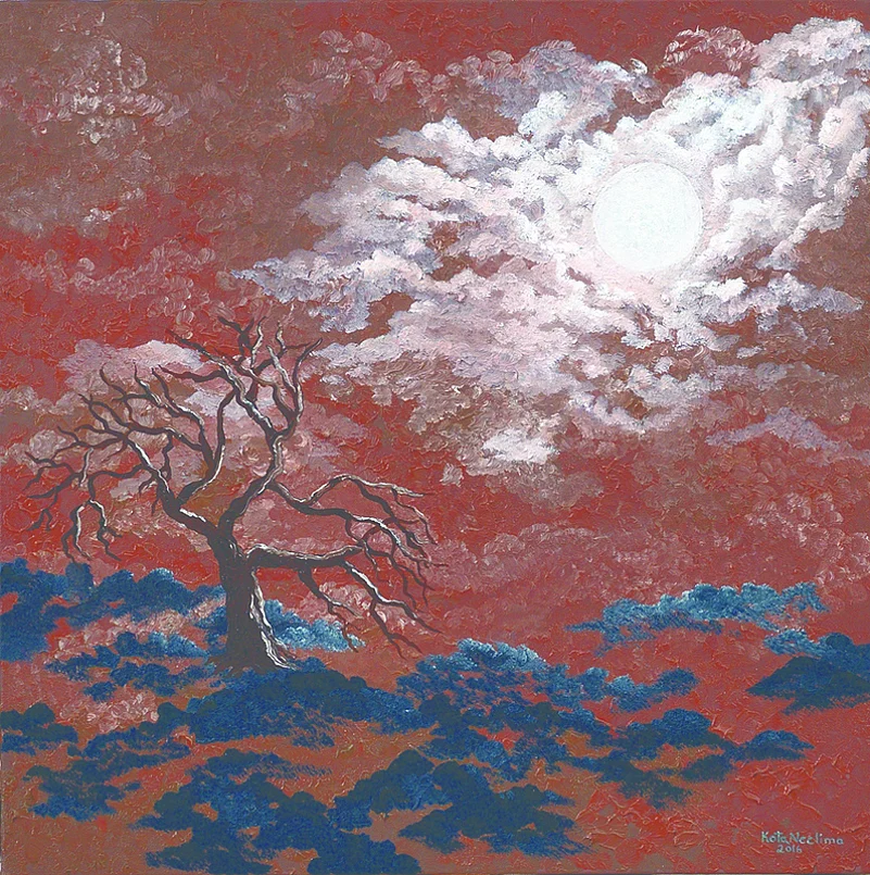 Neelima’s show, which is on till January 16, has a segment under ‘The Moon’, where the surreal quotient particularly thickens. One has the celestial body seen in a sky that is brown of all colours amid a cluster of clouds that seem to find bluish reflections below, where a lone leafless tree pops up a white-lined silhouette and leaves it to the viewer to assess—if at all—whether it’s anchored on earth or floating in the air. “A pair of young visitors just told me the image reminded them of bedtime stories,” adds the artist, who has family moorings in paddy-rich Krishna district’s Kota village of Andhra Pradesh.