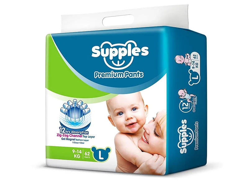 For infants weighing 9 to 14 kg Supples Premium Diapers in the Large size with 62 packs are perfect. They uniformly distribute liquid and maintain the diaper's dryness with ADL Technology and a top layer with a Zig-Zag channel. Offering outstanding liquid absorption and up to 12 hours of dryness is the Gel Magnet Bottom layer. Count on Supples for a contented and cosy baby.