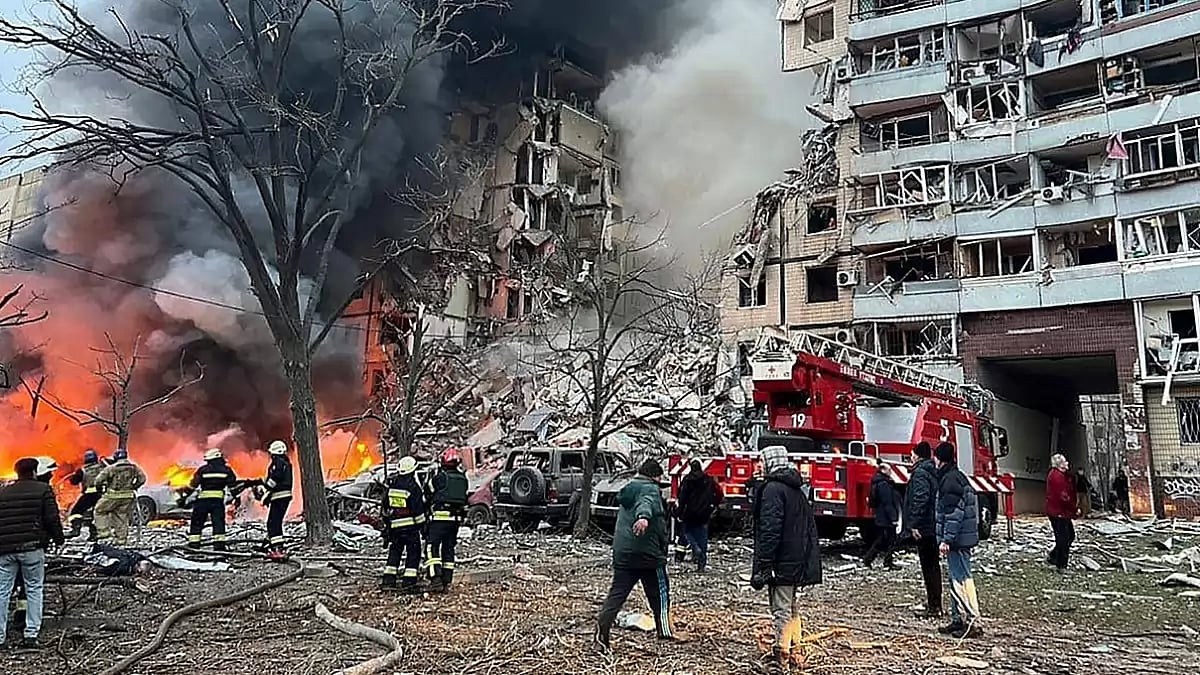 Images from the scene relayed by Zelenskyy on his Telegram channel showed firefighters battling the blaze as pockets of fire poked through multiple broken windows of a building. Charred and damaged vehicles littered the nearby ground.