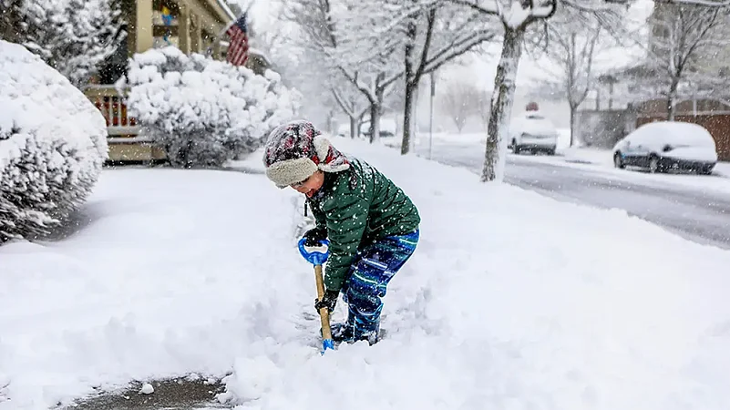 Colorado gets covered with a fresh blanket of snow with trees turning white and people shovelling snow from the roads.