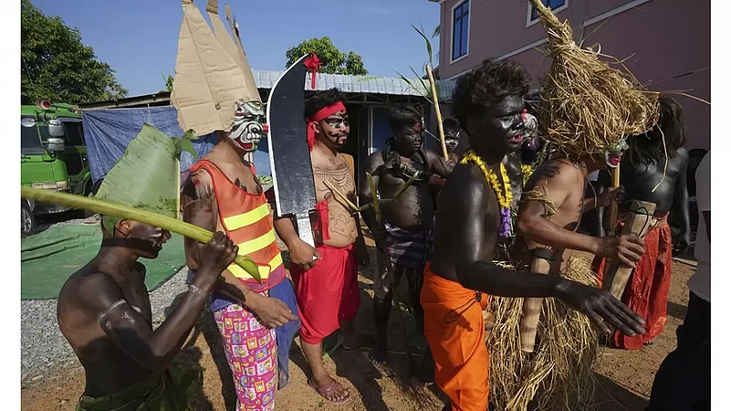 The people in Cambodia perform during a ghost painting ceremony to invoke rain amid the rice planting season in the country.