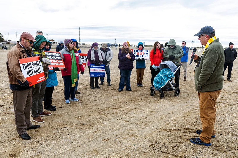 A group of about 15 protesters gathered outside the prison Wednesday, at one point singing “Amazing Grace.”