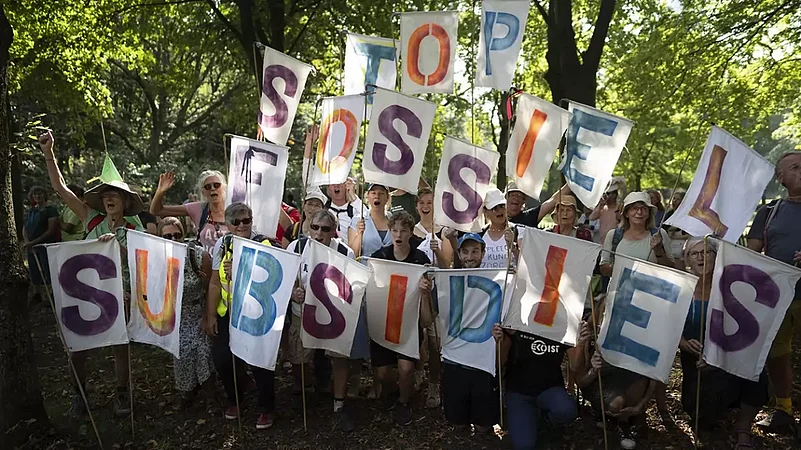 Protestors displayed banners reading "Stop Fossil Subsidies" after they gathered to block a highway during a climate protest of Extinction Rebellion and other activists near the Dutch parliament in The Hague, Netherlands. The Dutch police used a water cannon to disperse demonstrators from their gathering.