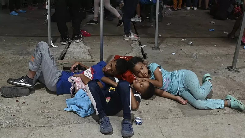 Migrant children sleep on the ground at a Migrant Temporal Attention Center, as they wait for transportation to continue on their way north to Nicaragua and hopefully to the Mexico-United States border, in Paso Canoas, Costa Rica. Panama and Costa Rica launched a plan to quickly bus thousands of migrants through Panama to the Costa Rican border, as the countries continue to grapple with the increasing number of migrants.