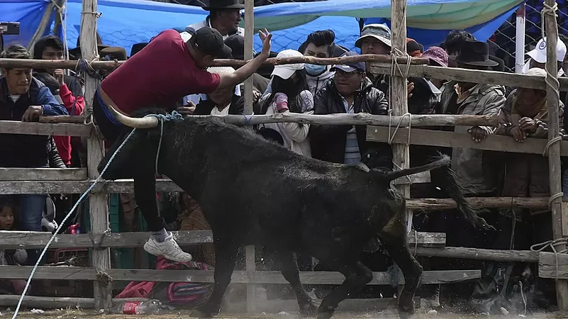 Bullfighting was organised in the Huarina village of South American country Bolivia to celebrate the Our Lady Of The Rosary Festival. It was a parody performance of the Spanish bullfight that did not include the sacrifice of the bull.