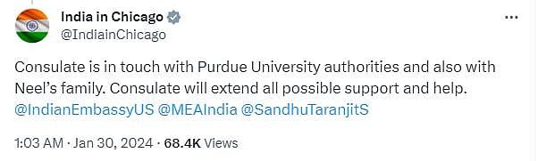 Reasponding to Neel's mother's tweet, India's Consulate General in Chicago said, "(The) Consulate is in touch with Purdue University authorities and also with Neel’s family. Consulate will extend all possible support and help".
