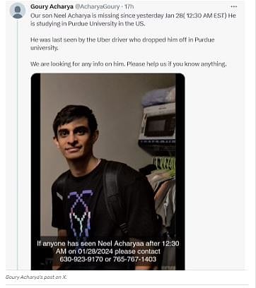 "Our son Neel Acharya is missing since yesterday Jan 28( 12:30 AM EST) He is studying in Purdue University in the US. He was last seen by the Uber driver who dropped him off in Purdue university. We are looking for any info on him. Please help us if you know anything," she wrote on X.