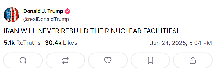 On June 23, Trump took to Truth Social saying, “If the current Iranian Regime is unable to MAKE IRAN GREAT AGAIN, why wouldn't there be Regime change??? MIGA!!!”