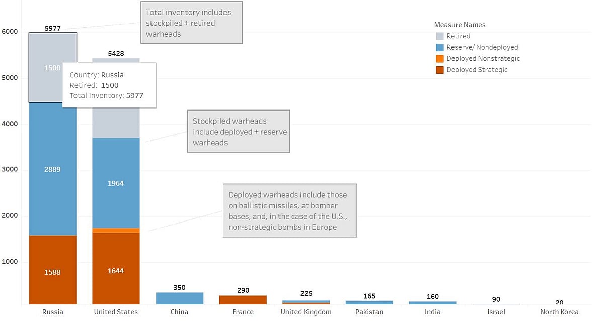 As per FAS, Russia tops the list of countries owning nuclear weapons, with an estimated 5,977 total warheads. Of these, 1,458 are actively deployed (current START II treaty limits both the U.S. and Russia to 1550 deployed total), 3039 are inactive but available to be made active, and 1,760 are retired and awaiting dismantling while the numbers for The United States stands closely at with 5,550 total nuclear weaponsamongst which 1,389 are active, 2,361 inactive but available, and 1,800 are about to be dismantled.