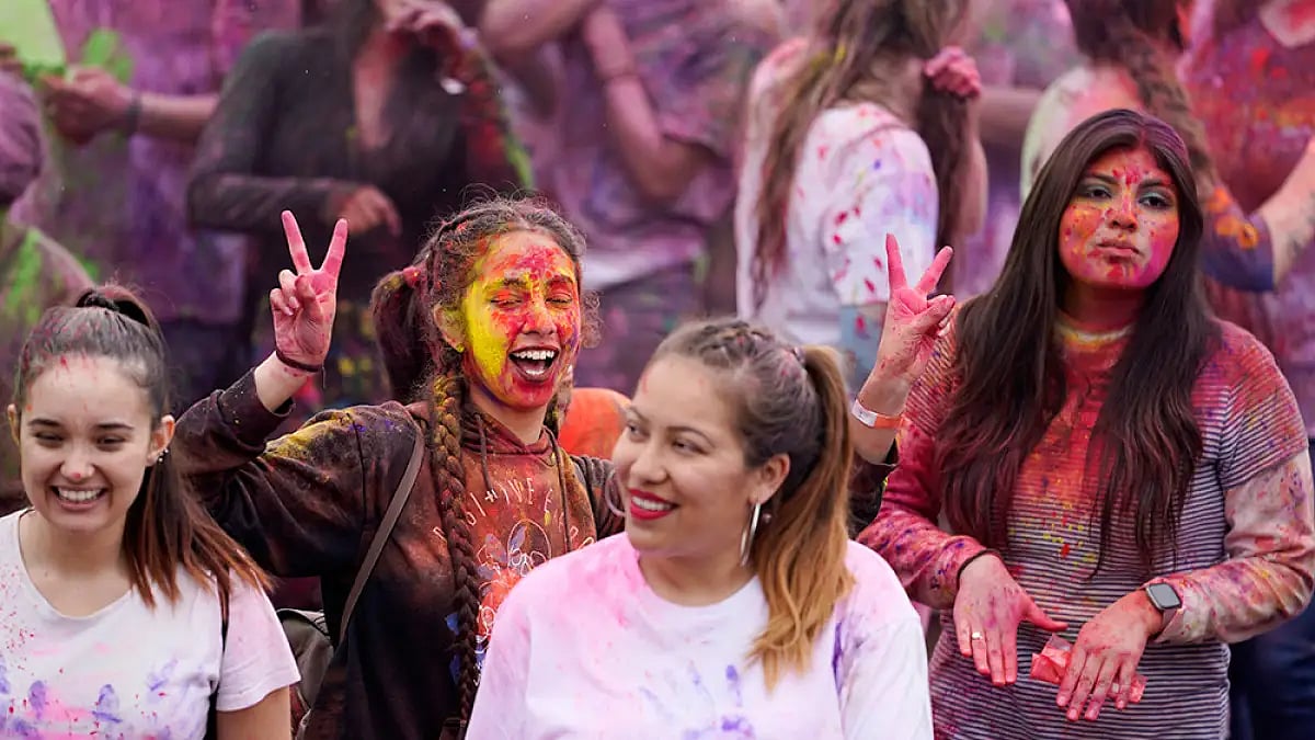 People in Centreville in American state of Virginia play with colours at the Festival of Colors procession at Bull Run Special Events Center.