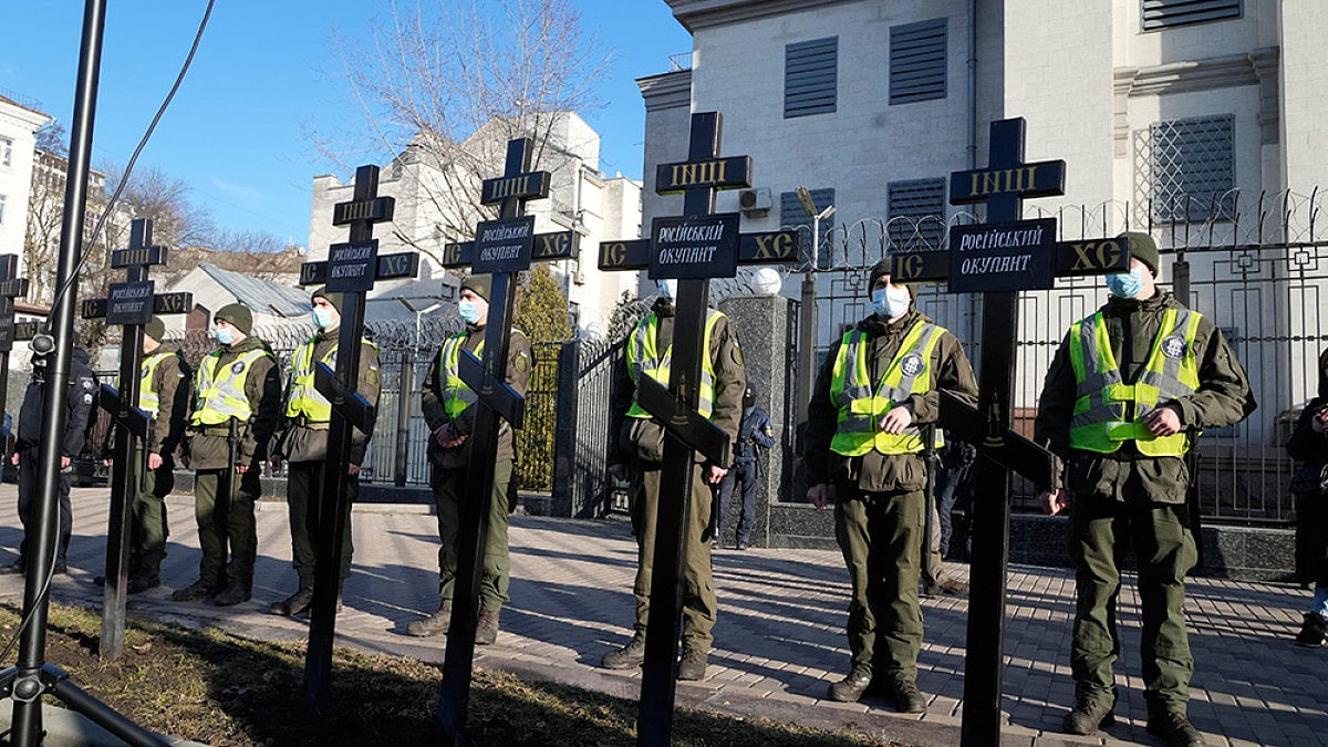 People protest in front of the Russian embassy in Kyiv as tension escalates between Russia and Ukraine.