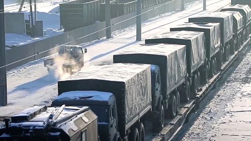Security camera footage shows a line of Russian military vehicles crossing into Ukraine from Russian-annexed Crimea.
