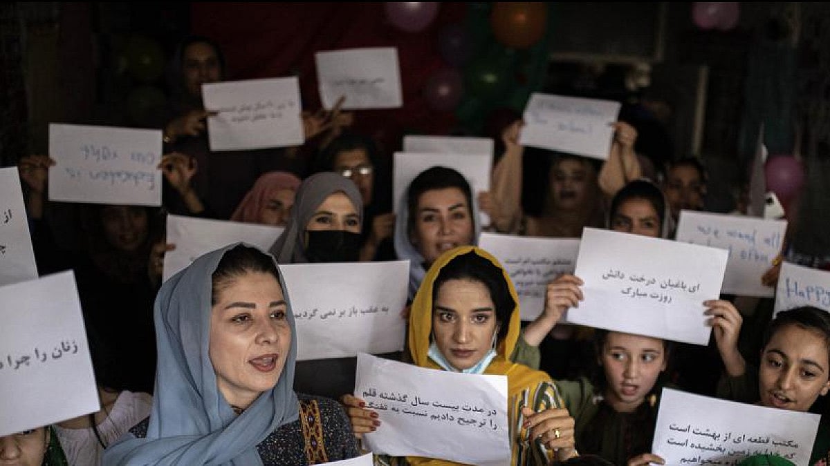 At Sunday's demonstration in Kabul, women carried placards demanding equal rights and shouted: “Justice!” They burned a white burqa and said they cannot be forced to wear the hijab.