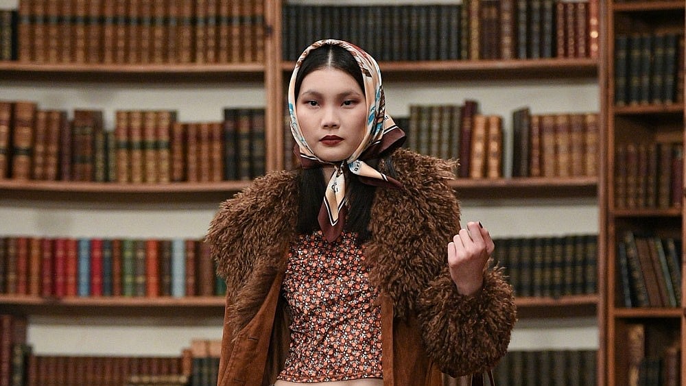 Drawing inspiration from the iconic Agatha Christie character Miss Marple, Sui transported her audience back to '90s English sleuth chic with a collection that exuded charm and sophistication. Checkered sweaters, scarves, and knee-high socks paired effortlessly with newsboy caps and pleated skirts, while bejeweled brooches added a touch of vintage elegance.