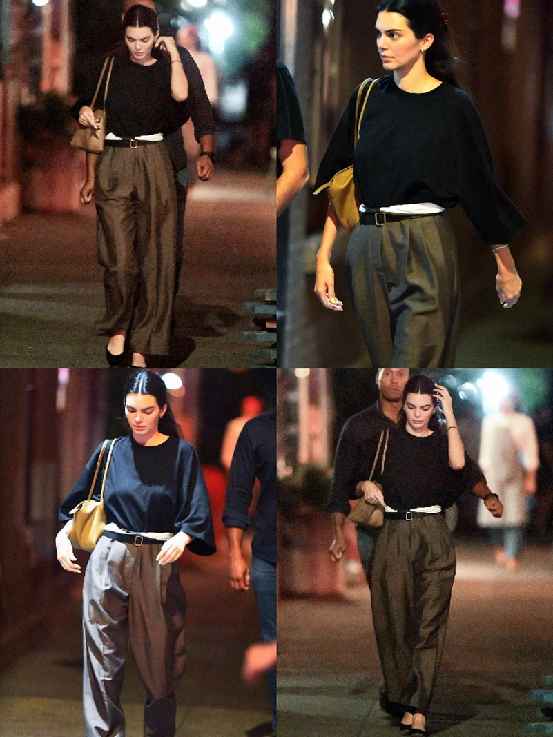 For the casual outing, Jenner sported a laid-back ensemble, layering an oversized black tee over a white tank and pairing them with loose-fitting tan trousers. She accessorised with a sleek black leather belt and black ballet flats, completing her look with a chic tan leather handbag.