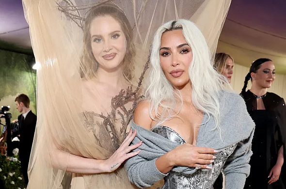 In her Vogue interview, Del Rey was joined by Kim Kardashian, with whom she recently collaborated on a Valentine's Day campaign for SKIMS. Del Rey remarked on the similarity of their outfits, noting their "sister corset shapes," which echoed Kardashian's dramatic Margiela corset by John Galliano.