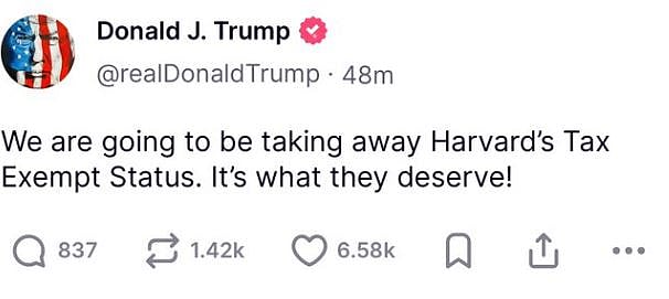 "We are going to be taking away Harvard’s Tax Exempt Status. It’s what they deserve!" Trump said in a post on his social media platform.