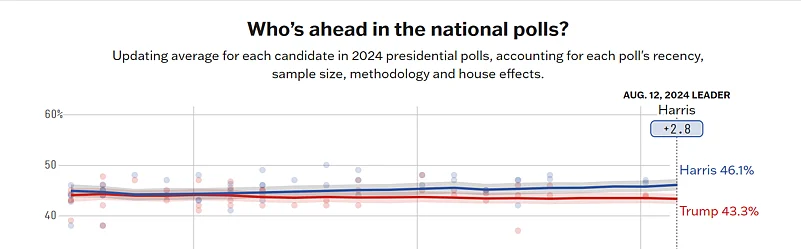 As per the latest data from FiveThirtyEight, Vice President Kamala Harris currently maintains a three-point lead over Republican candidate and former president Trump.