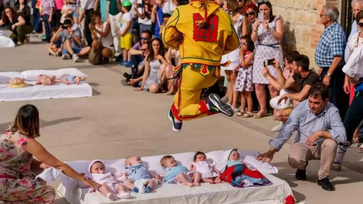 In the small village of Castrillo de Murcia, Spain, El Colacho takes place during the celebration of Corpus Christi. Participants dressed as the Devil jump over babies lying on mattresses in the street, symbolizing the cleansing of sin.