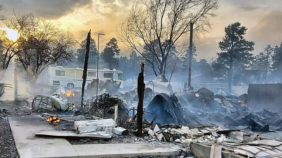 Homes and farms were turned to crisp after a wind-whipped wildfire forced a hurried evacuation of thousands of residents and animals in Flagstaff, Arizona.