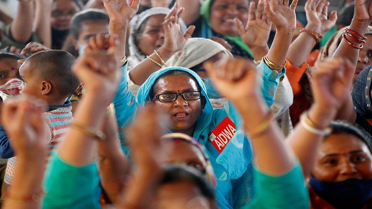 One banner read "control contractors, not women," referring to contractors who are accused of ignoring building regulations and contributing to the devastation.
