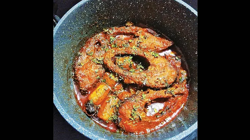 Despite the fancy variety of meat available in Kashmiri Pandit cuisine, my personal favourite is mujje gade (Kashmiri freshwater fish cooked with radish). The cooking process, as a matter of compulsion, is accompanied by Begum Akhtar singing on my speakers. I put my favourite playlist on and start marinating the fish with a little oil in which I mix a generous amount of turmeric with salt. Begum Akhtar, in the meanwhile, croons the exalted verses written by Ghalib’s contemporary, Momin Khan Monin, “Woh jo hum me tum me qaraar tha”. I deep fry the fish—after marinating them for 30 minutes—in mustard oil till they turn golden brown. Fish is never to be touched while frying, and after removing the fish I add radish to the hot oil. Radish is followed by the addition of yange (asafoetida), budde ael (black cardamom) and zuer (cumin seeds). After the radish is fried, I add the fried fish to the vessel, supplementing it with copious amounts of red chilli. It is then mandatory to add a glass of water to prevent the red chilli from burning. While the water is yet to come to a boil, I make myself a drink and stand at the kitchen counter to hear Begum sahiba render flawless dadra in “Humri atariya pe aa jao sawariya”. Water comes to a roaring boil before I finish my drink, so it is time to add shonth (dry ginger powder) and badiyan (fennel powder) to it. The delicate dish is finally sealed with the addition of a little garam masala and ajwain. Red hot mujje gade is served over a sumptuous quantity of boiled white rice.