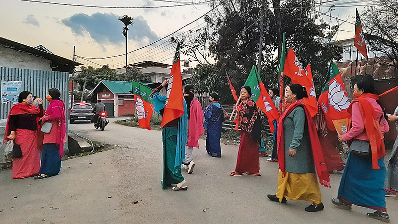 Five years down the line, the BJP seems to be high on confidence to return to power, despite all the infighting that resulted from a steady flow of defection from other parties—a problem of plenty. Resultantly, many of these disgruntled BJP leaders have joined the Janata Dal (United)—BJP’s alliance partner at the Centre and in Bihar—which has emerged as another significant player. It is the infighting in the BJP over distribution of tickets that has possibly led to the JD(U)’s rise to pre-poll prominence. Except for former cop Th. Brinda, who had been at loggerheads with the chief minister, most other JD(U) candidates were originally BJP ticket aspirants, a party leader from the valley says, unwilling to be identified. “In case of a hung verdict, the BJP would surely tie up with the JD(U) if they have MLAs and these MLAs can then bargain for ministerial posts,” the leader explains. With four-to-five-corner battles in most of the 60 seats, a hung verdict could not be ruled out, political observers say.