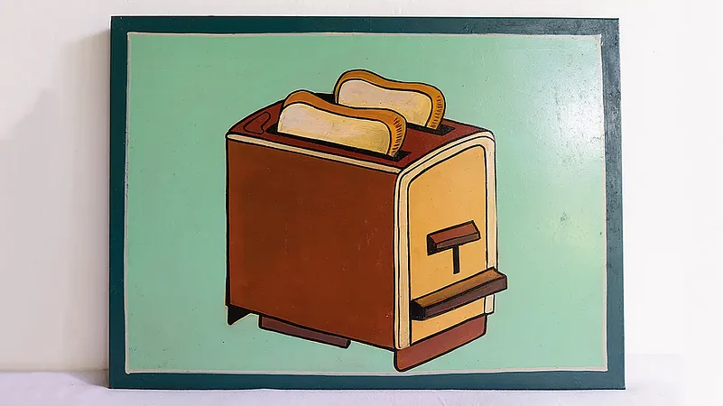 Cut to Angry Indian Goddesses (2015), the film centred on a group of eclectic women who come together for a holiday in Goa, pairing drinks with most meals, mulling over career updates and life choices. In this world, the kitchens reflect cosmopolitan aspirations and lifestyles—food is about pleasure, cooking is recreational, and boring meals are cooked by the house help. We see tomatoes being sliced and seasoned for pasta, next to Indian celebrity chef Ritu Dalmia’s cookbook, Diva Green. A pop-art painting of a toaster created by Seth serves as a backdrop to conversations about the perils of consuming bread and gluten.