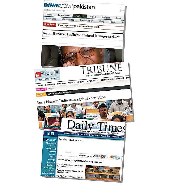 In reporting extensively on Hazare’s fight, the newspapers appear to have subtly launched a campaign against corruption in Pakistan too. Mohammad Malik, resident editor of English daily The News, which has been publishing tales of corruption involving Pakistan People’s Party bigwigs, tells Outlook: “The chattering classes here are equally excited regarding Hazare’s potential to stage a revolution for radical change. Corruption remains an issue for us as well, in fact it is the number one issue. We see the Hazare uprising as a commendable exercise and this is why you see an informed campaign on the frontpages.”