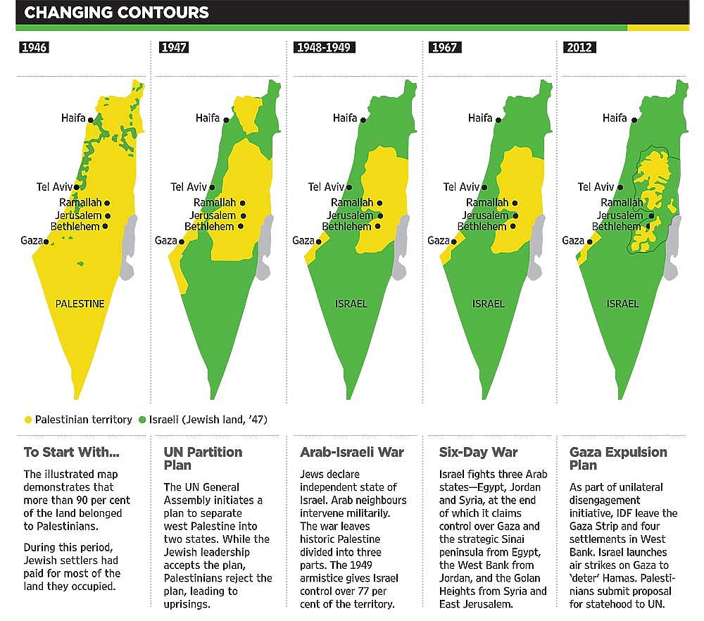 But as parallel and differing narratives come out of Israel and elsewhere to explain the current violence in Gaza, many experts say that to understand the present situation one needs to go back to 2006, when Hamas entered the scene as a legitimate stakeholder on the Palestinian landscape. One could in fact go back even further, to the beginning, circa 1948, when Palestine was partitioned to create Israel. Between then and now, the Palestinian share of the land has shrunk (see graphic), while that of Israel has increased consistently and substantially. Israel, for all practical purposes, remains the occupying force in Palestine.