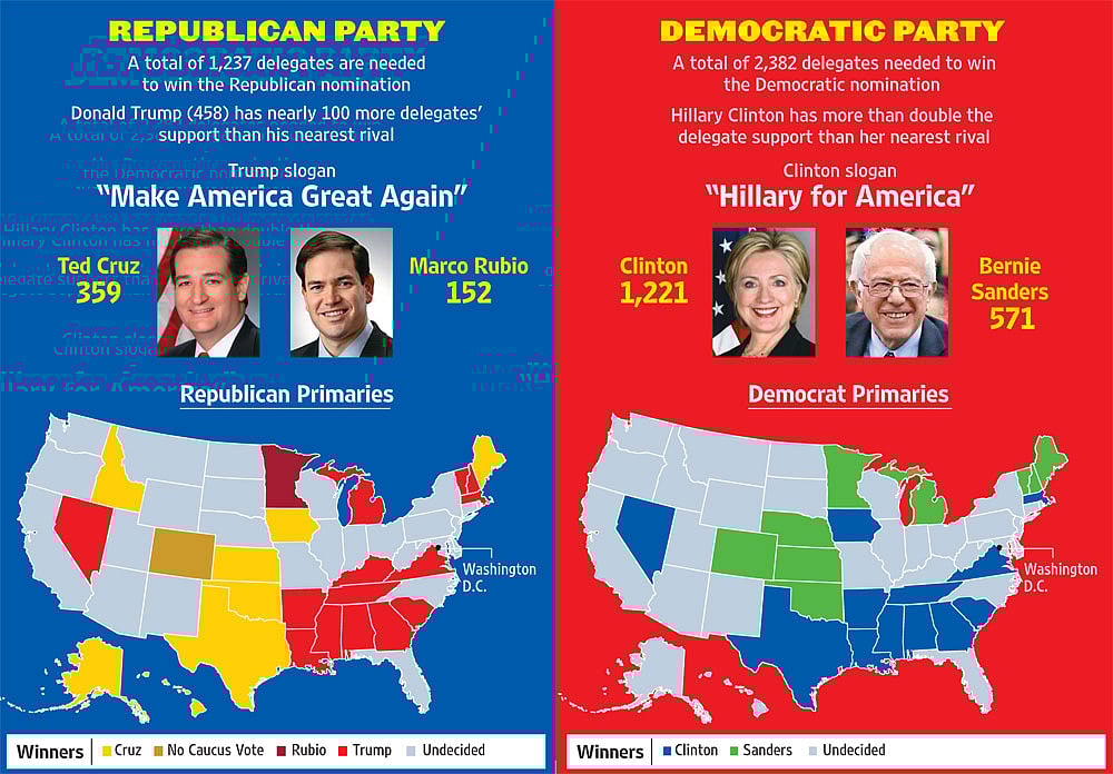 In mid-2015, when he swaggered into the crowded ring of Republican nomination hopefuls, nobody took him seriously. He had a 50-1 shot at winning the nomination. However, after his string of victories at the Republican caucuses, including seven of the 11 states on Super Tuesday, Trump is the front-runner by a long distance. He is also more popular than Ted Cruz and Marco Rubio—the only candidates standing who can challenge him—among all sections of voters: men, women, old, young, rich, poor, married, unmarried, evangelical, non-evangelical, those with college degrees and those without, whites and blacks. However, Hispanic voters—crucial for any win—detest him. His Michigan and Mississippi caucuses on Friday showed that his popularity was not likely to wane. Next week, he is also predicted to win Illinois.